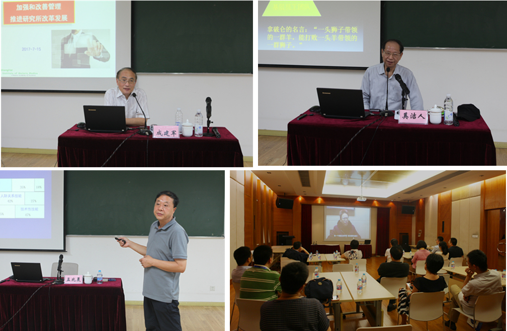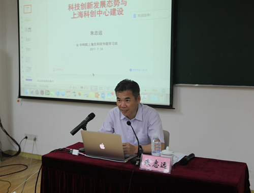 上海分院院长、上海高等研究院党委书记、上海科技大学党委书记朱志远,中国浦东干部学院原常务副院长奚洁人,中科院上海药物研究所原党委书记成建军,上海科技管理干部学院副教授孟兆晨受邀分别做了《上海科创中心建设的发展机遇与挑战》、《领导力的建设与提升》、《加强和改善管理 推进研究所改革发展》、《管理理论与艺术》等主题报告。
