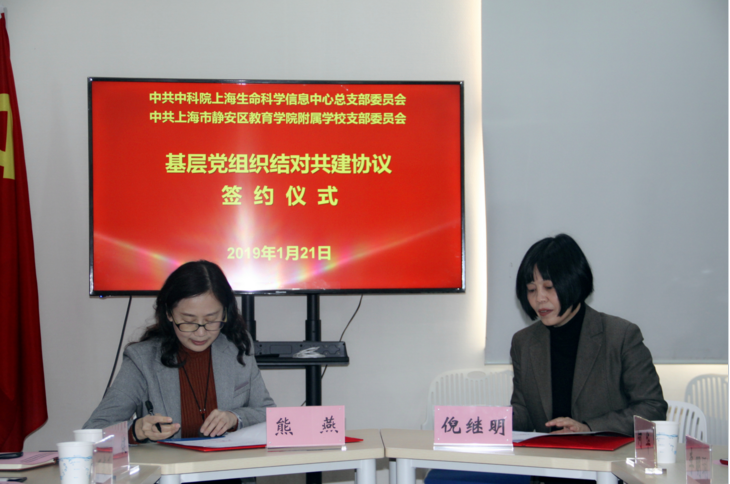 喜气洋洋辞旧岁,满怀憧憬迎新年。在纪念改革开放40周年和喜迎建国70周年之际,中科院上海生命科学信息中心党总支与静安区教育学院附属学校党支部党建结对签约仪式于1月21日上午在岳阳路319号党支部组织生活开放点举行,这是双方以实际行动贯彻习近平新时代中国特色社会主义思想的具体体现,是科研院所与基础教育携手共促党建工作的有益尝试。静安区教育学院附属学校党支部书记倪继明、校工会主席兼党组织委员李明琍、校长助理兼教导主任逯怀海,信息中心党总支书记熊燕、副主任缪有刚等领导出席活动。