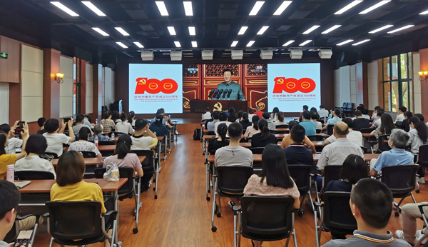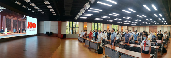 2021年7月1日上午8时,庆祝中国共产党成立100周年大会在北京天安门广场隆重举行。中国科学院上海营养与健康研究所党委组织100余名党员在信息中心明德厅集中收看,奋战在科研、管理、支撑等条线,暂时不能离岗的党员群众自发在工作岗位上收看、收听网络直播。