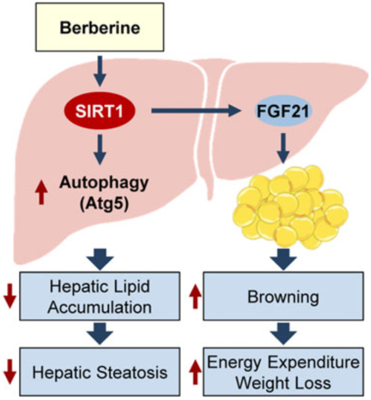小檗碱通过肝脏SIRT1发挥其增强自噬的作用,进而下调肝细胞中脂质沉积水平,改善脂肪肝。小檗碱-SIRT1-FGF21作用轴的激活或许可以成为通过促进脂肪组织棕色化和增强能耗来治疗肥胖的新途径。