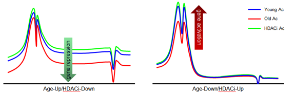 大脑的炎性衰老是衰老相关的神经退行性疾病的一个主要标志。研究人员通过对人和小鼠大脑中H3K27ac和基因表达数据的整合分析,发现随衰老上调和下调的基因上具有完全不同的H3K27ac修饰模式。尽管H3K27ac在两类基因的启动子上均有分布,然而富集免疫相关功能并随衰老上调的基因的基因体上却有着更为广泛的H3K27ac修饰,并且这些修饰会随着衰老逐渐丢失。与启动子区H3K27ac的转录激活功能不同,基因体超乙酰化抑制了炎性衰老相关基因的过度激活,并且基因体上的H3K27ac水平,可以用来预测基因在衰老过程中的变化方向。上述研究证实了H3K27ac在随衰老上调或下调的基因上行使截然相反的调控功能,并且提出了基因体超乙酰化抑制转录的新模式。
