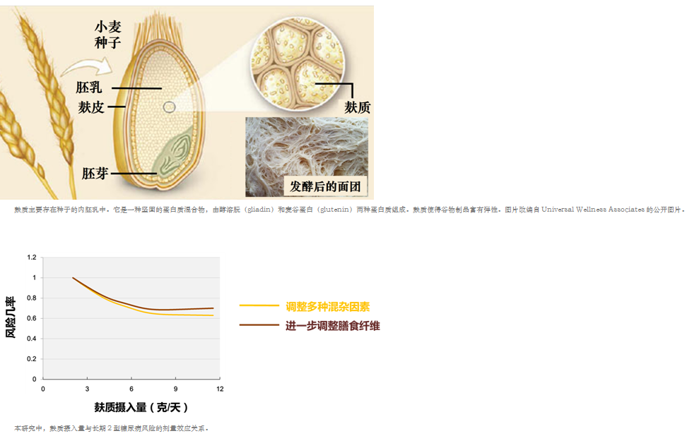 麸质是小麦、大麦和黑麦胚乳中的主要贮藏蛋白。中国人日常饮食中,所吃的“面筋”就是面粉经过反复水洗后剩余的麸质。在全世界范围内,有少量人(约1%)对麸质过敏,导致自身免疫反应并引起乳糜泻。在过去的几年中,“无麸质饮食”在许多国家越来越受欢迎。大众普遍认为摄入无麸质饮食有益于健康,特别是对控制体重有好处。但是这种观点缺乏关于麸质摄入对人群健康影响的证据。一些小型干预研究报道高剂量的麸质摄入(60-100 g/day)对健康个体和血脂异常人群无明显副作用,而每天摄入60-80g麸质可降低血脂、血压,减少氧化应激。为了研究麸质摄入对健康的潜在影响,本研究检验了人群中典型麸质摄入量(2-12g/day)与2型糖尿病之间的关系。