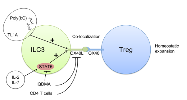 肠道炎症性疾病严重威胁人类健康,Treg是控制疾病发展的重要细胞类型之一。Treg高表达OX40(OX40L的受体),OX40已经被证明对Treg的扩增、存活和记忆都具有重要作用。OX40L过去被报导主要表达在抗原提呈细胞上,小鼠脾脏淋巴组织诱导细胞(lymphoid tisssue inducer, Lti)组成型表达OX40L,小鼠脑膜和人扁桃体中也发现了OX40L+ ILC3的存在。ILC3是固有免疫细胞的一个亚群,参与机体对抗肠道细菌感染、调控慢性炎症和组织修复。ILC3与T细胞的相互作用广泛存在,肠道ILC3是否表达OX40L,以及是否通过OX40L对肠道Treg产生影响,这些问题目前并没有被报导。
