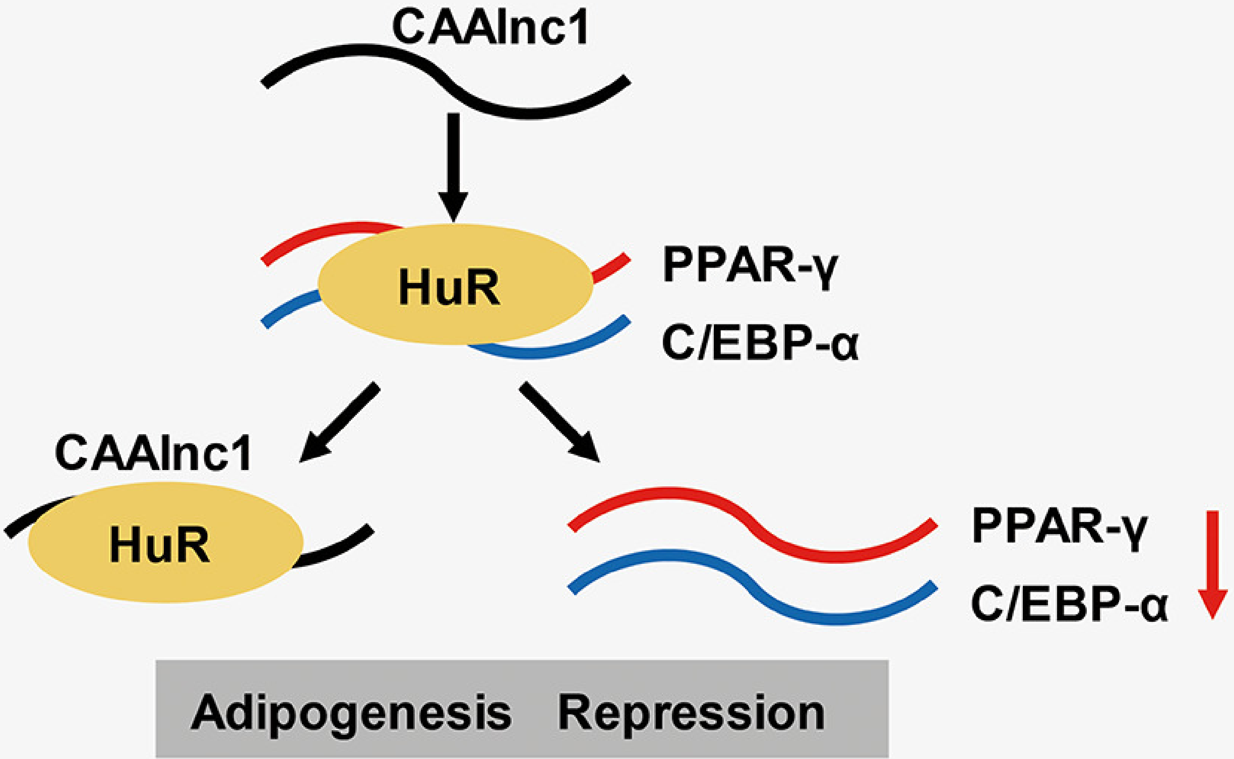 在吴国豪教授、冯英研究员的共同指导下,中山医院的博士研究生沈雷等利用芯片筛选了癌性恶病质脂肪丢失相关lncRNAs,并进一步探讨了癌性恶病质脂肪丢失相关lncRNAs在脂肪代谢中的功能及机制。该研究通过构建癌性恶病质小鼠模型,利用芯片对癌性恶病质小鼠脂肪中差异表达的lncRNAs进行了筛选,鉴定了多条lncRNAs在癌性恶病质小鼠脂肪中差异表达,其中CAAlnc1在癌性恶病质小鼠脂肪中高表达。敲减及过表达实验结果显示CAAlnc1能抑制脂肪分化,其可能通过抑制脂肪分化参与了癌性恶病质脂肪丢失。RNA pulldown及RIP实验结果显示CAAlnc1能与HuR结合。进一步研究发现,CAAlnc1可能通过抑制HuR与C/EBP-α及PPAR-γ mRNAs的结合而使C/EBP-α及PPAR-γ的表达降低,从而抑制脂肪分化。