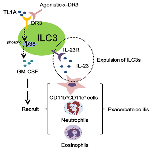 该项研究利用DR3激动性抗体(α-DR3)在体内激活TL1A/DR3信号,从而研究TL1A/DR3信号对ILC3的调控作用。研究发现激活DR3信号会造成大肠ILC3细胞数目的减少。利用中和性抗体中和体内的GM-CSF和IL-23都能够显著地逆转α-DR3引起的大肠ILC3减少。机制研究发现,α-DR3通过活化ILC3的p38信号通路从而促进其GM-CSF的分泌。GM-CSF分泌的增加能够进一步导致招募致炎性髓系细胞(嗜酸性粒细胞、巨噬细胞以及中性粒细胞)到肠道,髓系来源细胞的浸润最终造成IL-23表达的增加和肠道炎症的加重,IL-23则最终造成大肠ILC3细胞的减少。该研究利用可溶性DR3蛋白中和体内的TL1A能够有效地缓解α-CD40以及DSS诱导的肠炎。另外,α-DR3的体内处理能够加重DSS诱导的肠炎,并且α-DR3对肠炎的加重作用并不依赖于适应性免疫系统。更为重要的是,在ILC3缺失的情况下,α-DR3不能够加重DSS诱导的肠炎,这表明α-DR3加重肠炎的作用依赖于ILC3。
