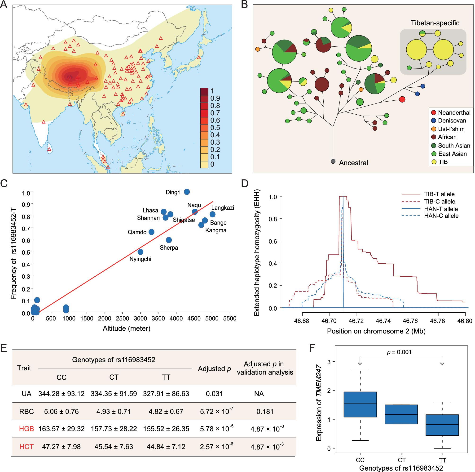 图:藏族人群适应性变异TMEM247-rs116983452-T的群体遗传解析和功能统计学分析