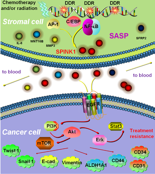 肿瘤微环境中衰老细胞衍生的SASP因子SPINK1激活残存癌细胞、导致其获得性耐药发生发展的分子机制