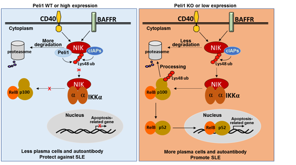 在本研究中,博士研究生刘俊利等在肖意传研究员指导下,分别利用遗传小鼠模型和临床患者数据验证,揭示Peli1可通过负调节非经典NF-κB信号通路以抑制B细胞的自身抗体的产生,以及系统性红斑狼疮的发病。在遗传小鼠模型中,Peli1在B细胞中缺失后可显著促进B细胞的活化与抗体的产生,此外,Peli1缺失后会促进小鼠SLE的病理指征,包括更多的IgG在肾小球的沉积,以及血清中检测到更多的抗核抗体和抗自身抗体。进一步的分子机制研究发现,Peli1是非经典NF-κB信号通路关键蛋白激酶NIK的特异性的E3泛素连接酶,并介导了NIK的K48连接的多聚泛素化与降解作用,因此,当Peli1缺失后,B细胞中NIK会大量积累,并持续活化非经典NF-κB信号通路,进而促进了B细胞的活化与自身抗体的产生。与之相应,在临床SLE患者样本中,研究表明患者外周血单核细胞中PELI1的表达与SLE的病理评分及血清中IgG浓度等呈现负相关性,进一步证明了PELI1负调节人SLE病理的作用。