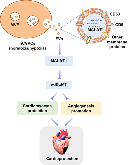 该研究利用小鼠急性心梗模型揭示,心梗急性期心肌注射hCVPC-EVs可有效促进心梗心肌的修复,hCVPC-EVs组可显著减少心梗后心肌细胞凋亡、促进血管生成和减少纤维疤痕形成;并且低氧预处理hCVPCs可显著提升 hCVPC-EVs的心脏保护作用。机制分析发现低氧预处理hCVPCs可显著提升 hCVPC-EVs中长链非编码RNA(lncRNA)MALAT1的含量,并且给予hCVPC-EVs后心肌细胞与心肌组织中的MALAT1含量显著升高。进一步分析揭示hCVPC-EVs促进血管生成和抑制心肌细胞凋亡的作用至少部分通过MALAT1介导,其可通过与miR-497结合,抑制其表达,进而保护心肌细胞、促进内皮细胞成管。研究发现揭示了hPSC-CVPCs修复心梗心肌的作用方式和新的调控机制,并提示hPSC-CVPC及其分泌的细胞外囊泡有可能用于缺血受损心脏的治疗。