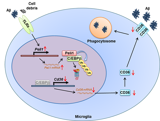在先前的研究中,肖意传研究组的科研人员发现Peli1在小胶质细胞中特异性高表达,并介导调节自身免疫性神经炎症、帕金森氏病(Parkinson's Disease, PD)和病毒性脑炎的发生发展。本研究进一步明确了Peli1在另一种常见神经退行性疾病AD中通过负调控小胶质细胞对Aβ的吞噬能力,致使脑部大量Aβ沉积无法被清除,从而造成AD病情恶化的病理机制。机制研究表明,Peli1直接结合并介导转录因子C/EBPβ的泛素化及降解,由于C/EBPβ是清道夫受体CD36的关键转录因子,故Peli1敲除后显著促进了CD36基因的表达,由此增强了小胶质细胞对Aβ的吞噬作用。因此,在老年Peli1基因缺失的5×FAD转基因AD模型小鼠脑内,小胶质细胞对Aβ的清除作用显著增强,由此抑制了Aβ在脑部的沉积。此外,在5×FAD小鼠脑部小胶质细胞和AD病人脑组织中,Peli1的表达较正常对照明显升高,提示AD病理会诱导小胶质细胞中Peli1的表达。因此,小胶质细胞中Peli1是AD诊治的一个潜在新分子靶标。