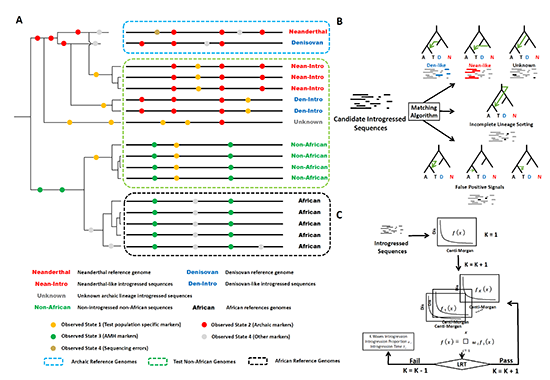 1)曾经发生在史前的基因交流,站在现代人类的立场,可视为远古人类对现代人类的基因渗入或遗传渐渗(genetic introgression)。由于基因渗入事件发生的时间比较久远(距今3~10万年前),古人类的基因片段由于基因重组往往碎片化为平均长度只有几万个核苷酸的DNA序列(人的基因组为30亿核苷酸长度),并且极度分散于现代人类基因组中。相比于近期的族群遗传融合(如美国黑人、南美拉丁裔人群)动辄几百万核苷酸大小的祖先片段,远古人类渗入的基因片段短了近百倍,为检测和判定工作带来诸多困难。除此之外,经过现代人类基因库几万年的重组稀释,远古人类基因片段总体上通常只占现代人全基因组序列的1~2%。极低的频率,极短的长度,和远古人类基因组数据的缺失等诸多因素都增加了从现代人类基因组序列中搜寻和鉴定远古人类基因片段的难度。而基于这1~2%的基因渗入信息推断史前人类发生的历史,则是一个更具挑战的问题。这也是长久以来各种方法的尝试都未取得良好效果的重要原因。研究团队为此专门设计了一种寻找远古人类基因渗入片段,基于渗入片段长度推断远古人类基因渗入历史的方法——ArchaicSeeker 2.0(图1)。该方法包含三个组成部分:(1)基于隐马尔科夫模型的渗入片段搜寻算法(seeking algorithm);(2)基于最大似然估计的序列匹配算法(matching algorithm);(3)基于似然比检验(likelihood ratio test)和最大期望算法(EM algorithm)的演化历史重构算法(history reconstruction algorithm)。相比于其他方法,ArchaicSeeker 2.0 有如下三个优势:首先,该方法通过渗入片段搜寻算法,可以从海量的现代人基因组数据中,快速鉴定潜在的渗古人类基因序列,并能精准判定每个片段的大小和确定边界;其次,该方法在判定基因渗入片段的祖源过程中不依赖于是否具备已知的远古人类基因信息;第三,基于ArchaicSeeker 2.0 的历史重构算法,不依赖于海量计算机模拟,即可有效地重构极为复杂的遗传渐渗历史。ArchaicSeeker 2.0 的这些独特优势性能在计算机模拟数据和实验数据分析中得到了系统的评估与确证。结果表明,在远古人类基因片段的判定方面, ArchaicSeeker 2.0 达到了超过90%的准确率,而误判率仅为约0.14%。在几乎所有的模拟实验中,至少 80%以上推断的古人类片段都能被匹配至正确的祖先上。同时,ArchaicSeeker 2.0 在遗传混合事件次数、基因渗入比例和遗传交融发生的时间估计上也有良好的表现。ArchaicSeeker 2.0 对远古人类基因渗入片段精准而高效地检测以及对遗传渗入历史的准确推断,也为研究现代人类和远古人类的混合历史重构提供了必备的信息和进一步分析的基础。