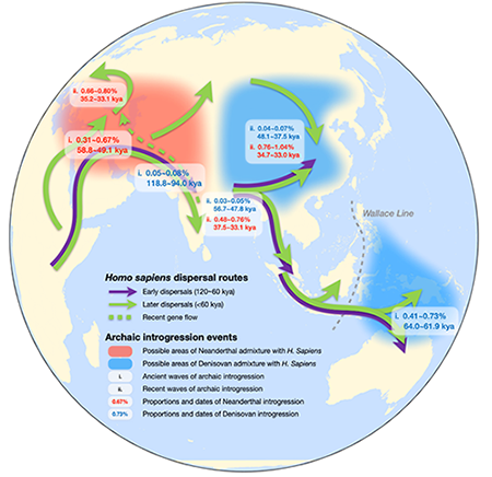 3)之前关于古人类与现代人类遗传混合的研究,大多基于现代人类“单次出非洲”的模型。然而研究团队发现,“单次出非洲”模型与现代人类史前和其他古人类如尼安德特人、丹尼索瓦人等的混合时间与次数存在矛盾。目前的数据需要至少两次出非洲迁移事件才能较好地解释。一次较早的“出非洲”迁徙发生在距今约6~12万年前,而较晚近的一次发生在距今6万年以后。早期走出非洲的现代人类祖先,在距今约9.4万年到11.9万年前,在中东、南亚附近,与丹尼索瓦人发生了第一次接触和基因交流。而后,他们继续向东前进,一部分留在南亚,一部分向北到达东亚南部,并分别与本地的丹尼索瓦人发生遗传交融。还有一支继续向东南迁徙,在距今6.2万年至6.4万年前,穿过华莱士线(Wallace Line)到达大洋洲与已先期到达的一支丹尼索瓦人融合。近期走出非洲的现代人类,距今4.8万年至5.9万年前,在中东地区与尼安德特人发生第一次接触和基因交流,之后,他们分别迁徙至欧洲、南亚、东亚,与各地尼安德特人发生了第二次族群融合。随后,南亚对欧洲的迁徙还将极少量的丹尼索瓦人的基因序列带入欧洲(图2-3)。