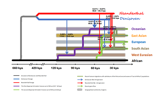 图2. 现代人类史前迁徙路线及其与远古人类的基因交流模式示意图