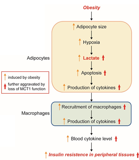 陈雁研究组对脂肪细胞高表达的单羧酸转运蛋白MCT1进行研究,这是体内最主要的乳酸转运蛋白。通过构建了脂肪组织特异性敲除MCT1的小鼠、以及利用细胞水平上的研究,发现脂肪组织中MCT1主要介导细胞乳酸的外排。敲除MCT1的小鼠在高脂饮食诱导的肥胖模型中不会显著影响体重,但是小鼠发生了更严重的胰岛素抵抗。对该表型进一步的研究发现,敲除MCT1会导致脂肪组织的促炎巨噬细胞的浸润增加,最终导致肥胖小鼠发生严重的系统性炎症。分子机制研究发现,MCT1敲除导致脂肪细胞中乳酸累积增加,脂肪细胞的凋亡信号被激活,并影响到脂肪细胞分泌的炎性细胞因子。分泌的炎症因子募集了巨噬细胞并通过巨噬细胞进一步放大了炎症信号,最终加重全身的胰岛素抵抗。