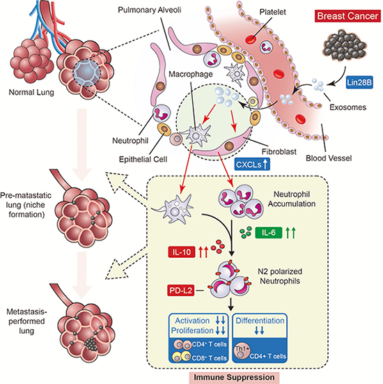 图注:Lin28B通过外泌体调节转移前肺组织免疫抑制促进乳腺癌转移新机制