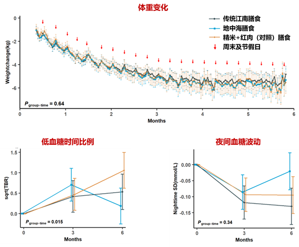 在中科院资助下,林旭研究员团队与瑞金医院宁光院士/王计秋研究员等合作,在本项平行化的随机对照干预中,共招募了 253名年龄25-60岁、超重或肥胖(BMI ≥ 24.0 kg/m2)且空腹血糖偏高(≥ 5.6 mmol/L)的志愿者。他们被随机分配到3种等能量限制(25%能量限制)膳食组:地中海膳食组(84人),传统江南膳食组(85人),或高精米和红肉摄入的对照膳食组(84人)。在为期6个月的干预中,研究人员每周在5个工作日中向志愿者提供早中晚三餐,并通过连接手机应用的体重秤和智能手环来动态监控体重和运动步数变化。志愿者分别在基线、干预3个月和6个月时受邀参加包括口服葡萄糖耐量试验、连续血糖监测、腹部脂肪检测(核磁共振)在内的体检。通过系统的分析,林旭组博士生罗耀淦和副研究员孙亮等发现:1)在6个月25%能量限制的干预后,地中海膳食组减重5.72 kg(95% CI:5.03,6.40),传统江南膳食组减重5.05 kg(95% CI:4.38,5.73),对照膳食组减重5.38 kg(95% CI: 4.70,6.06),同时腹部脂肪减少在3组之间也无显著统计学差异,提示了在有效的能量控制下,膳食模式优化并不能进一步显著提升减重效果;2)基于OGTT的空腹血糖、胰岛素、Matsuda指数(胰岛素敏感性指标)、血脂等心血管代谢指标在3组均显著改善,且无显著的组间差异;3)值得注意的是,CGM结果显示(图2):与对照膳食组相比,地中海膳食组显著降低了干预6个月后低血糖(葡萄糖 < 3.9 mmol/L)时间比例[-0.81%(-1.40,-0.21),P = 0.024];传统江南膳食也具有类似的优势[-0.56%(-1.15,0.03),P = 0.065]。总之,尽管摄入了更高比例的碳水化合物(7%),传统江南膳食在减重与血糖稳态控制方面均表现出与地中海膳食类似的效果。虽然传统江南膳食在我国长三角地区已具有悠久的历史,但作为新提炼出的膳食模式概念,“传统江南膳食”相关的研究刚刚起步,其食物组分及比例仍存在较大的提升空间,也期待更多的研究能够进一步优化我国本土膳食模式的最佳方案。