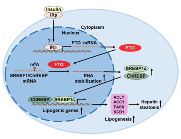 注:胰岛素刺激肝细胞后,FTO的表达增加。FTO可以通过m6A去甲基化来稳定SREBF1和ChREBP的mRNA,从而导致其蛋白质水平增加,最终促进了肝脏脂肪生成,导致肝脏脂肪变性。