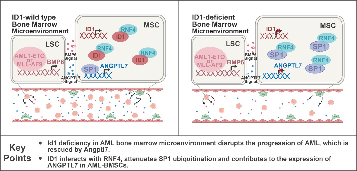 综上所述,该研究揭示了骨髓微环境中ID1通过促进ANGPTL7的表达调控白血病的发生发展,也揭示了AML细胞通过分泌BMP6促进骨髓微环境中ID1的表达。这条骨髓微环境和AML细胞相互影响的环路可能对临床AML治疗具有指导意义。