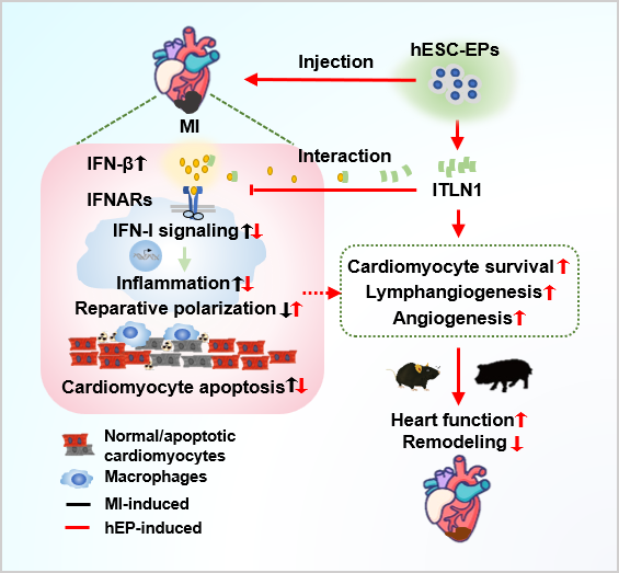 研究人员利用小鼠和猪心梗模型,结合多种研究方法发现心梗急性期移植hEPs促进小鼠心功能恢复、抑制疤痕形成,并伴随着单核/巨噬细胞浸润减少、修复型巨噬细胞增多、促进心肌细胞存活和血管、淋巴管新生。机制分析发现hEPs移植显著抑制梗死心肌炎症反应,尤其是下调I型干扰素(IFN-I)信号;IFN-I受体激动剂RO8191削弱hEPs介导的抑制炎症反应、促进修复型巨噬细胞极化和心肌修复的作用;质谱筛选和多方验证发现hEPs分泌内凝集蛋白(ITLN1),其可与IFN-β结合,模拟hEPs抑制IFN-I介导的炎症反应和促进修复型巨噬细胞极化的作用;移植ITLN1敲低的hEPs则取消hEPs在梗死心脏抑制IFN-I信号、炎症调控和心肌修复作用。进一步,在更接近临床的猪心梗模型证明移植hEPs抑制炎症反应、促进猪梗死心肌修复,且未观察到器官毒性。综上,hEPs移植促进小鼠和猪梗死心肌修复,其主要机制之一是hEPs分泌的ITLN1与IFN-β相互作用,进而抑制IFN-I途径介导的巨噬细胞炎症反应、促进修复型巨噬细胞极化。该研究揭示了hEPs及分泌的蛋白因子通过抑制IFN-I途径调控炎症反应,进而促进心肌修复的重要作用,并发现了调控IFN-β的新模式和调控炎症反应的新机制,证明精确调控急性心梗后炎症反应对心肌修复至关重要、提示hEPs有可能成为心梗后心肌修复的新型细胞来源。