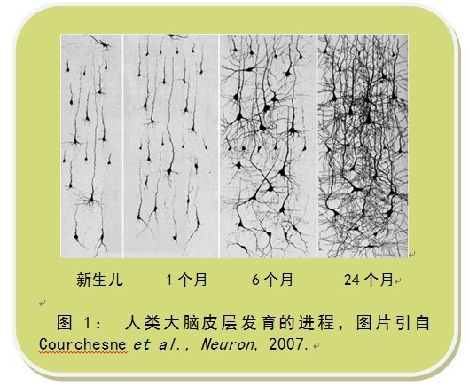 大脑的功能依赖于精确神经网络的建立。一个刚刚出生的婴儿已经拥有了几乎她/他未来大脑中的所有神经细胞(即神经元),然而这些神经元之间的连接还没有完全形成。外界因素,特别是来自环境的各种感觉刺激,对发育早期大脑中神经元的生长与功能性连接的形成(即突触的形成)至关重要。在人类的大脑皮层,这个过程一般在出生后的几年内完成(如图1),而在生长周期更快的小鼠中则可在几周内完成。已有很多工作研究了感觉刺激对大脑皮层发育与功能的影响,例如视觉的剥夺会导致视皮层(即主要处理视觉信息的大脑皮层区域)神经网络功能的减弱。除此以外,感觉剥夺还可以跨模态地影响其它脑区的功能,如失明的人可能有更灵敏的听觉。前人关于跨模态可塑性的研究主要集中在成年的个体上。在发育早期是否有同样或者不同类型的跨模态可塑性是未知的。