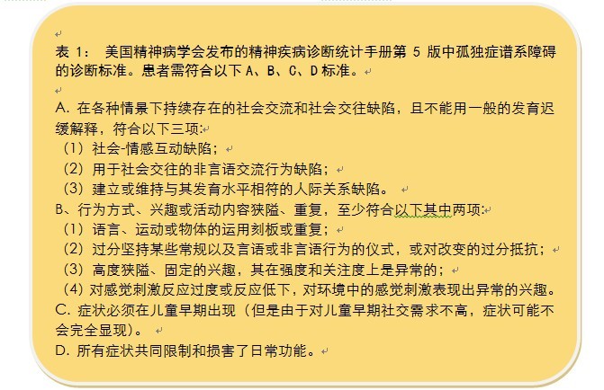 丰富环境、或者更多的感知觉刺激、更多的与同伴的交流可以促进脑发育,并且能在实验动物上增加催产素的表达。这对我们理解脑发育的过程或者对有感觉输入异常的儿童的治疗有什么借鉴意义吗?父母对一个失明的幼儿的抚摸是不能让她/他重新看到世界,但更多的触觉、听觉、嗅觉等感觉刺激可以缓解由于缺乏视觉输入而导致的其它大脑皮层发育的缺陷。这项工作对孤独症谱系障碍(简称孤独症)的研究也有重要的借鉴作用。在美国精神病学会最新发布的精神疾病诊断统计手册第5版中,孤独症的诊断标准添加了“对感觉刺激反应过度或反应低下”的标准(表一)。感觉过度敏感或低下在孤独症儿童中普遍存在,而且表现的时间普遍早于社会交流的障碍。催产素,由于其对社交功能的促进作用,已成为孤独症治疗的热点分子之一。上述研究结果提示催产素在发育更早期就对感觉皮层的神经环路形成有促进作用。鉴于孤独症患儿经常伴随有感觉输入的异常,孤独症患儿脑内的催产素表达水平是否也存在异常,可否通过给予催产素促进感觉皮层发育,从而改善孤独症儿童的症状有待进一步研究。此外,通过自然感觉刺激在体增加催产素的表达,从而促进幼年孤独症患儿的大脑发育,也是一个有待探讨的行为干预与治疗的方式。