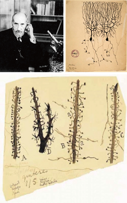 图1:西班牙著名的神经生物学家Santiago Ram ny Cajal(1852-1934)与其手绘的小脑浦肯野神经元以及不同形态的树突棘。图片引自参考文献[1]。