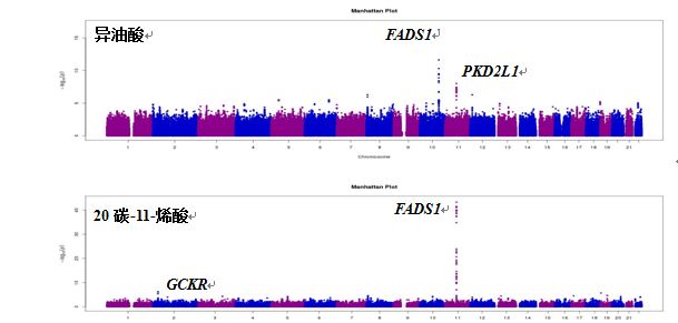图1: 单不饱和脂肪酸水平的全基因组关联分析曼哈顿图