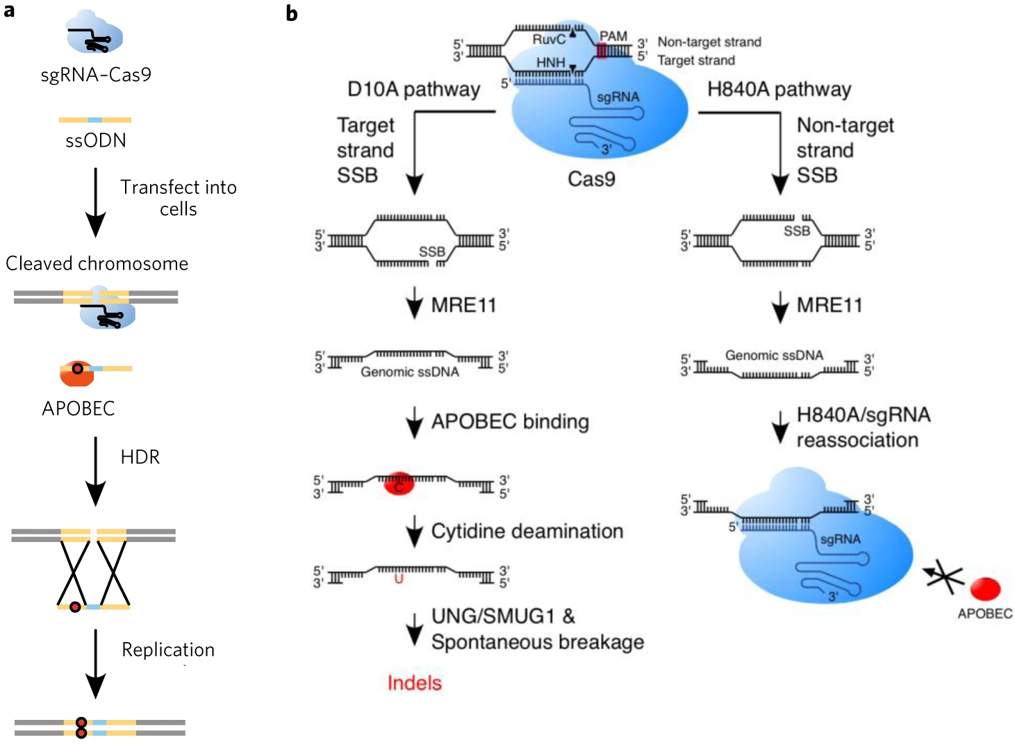 b.APOBEC在Cas9切刻酶D10A引起的单链断裂修复过程中产生indel突变。
