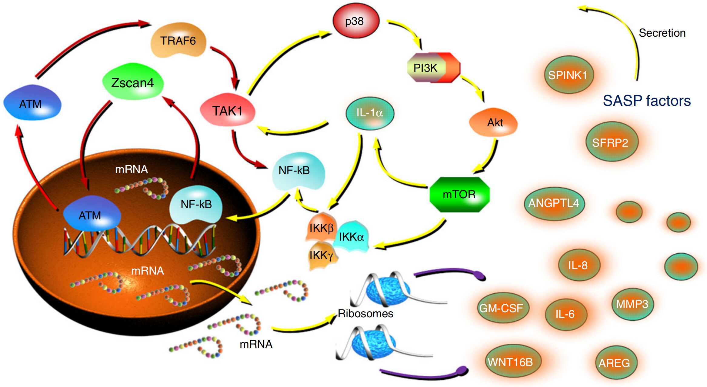 4月30日,国际学术期刊Nature Communications在线发表了中国科学院上海营养与健康研究院孙宇研究组题为“The senescence-associated secretory phenotype is potentiated by feedforward regulatory mechanisms involving Zscan4 and TAK1”的最新研究成果,文章报道了由药物毒副作用引发DNA损伤效应在临床治疗过程中引发体内细胞发生被动衰老,并在诱导衰老细胞出现一种强烈、持续和长期的分泌表型(senescence-associated secretory phenotype, SASP, 衰老相关分泌表型)过程中的关键作用。