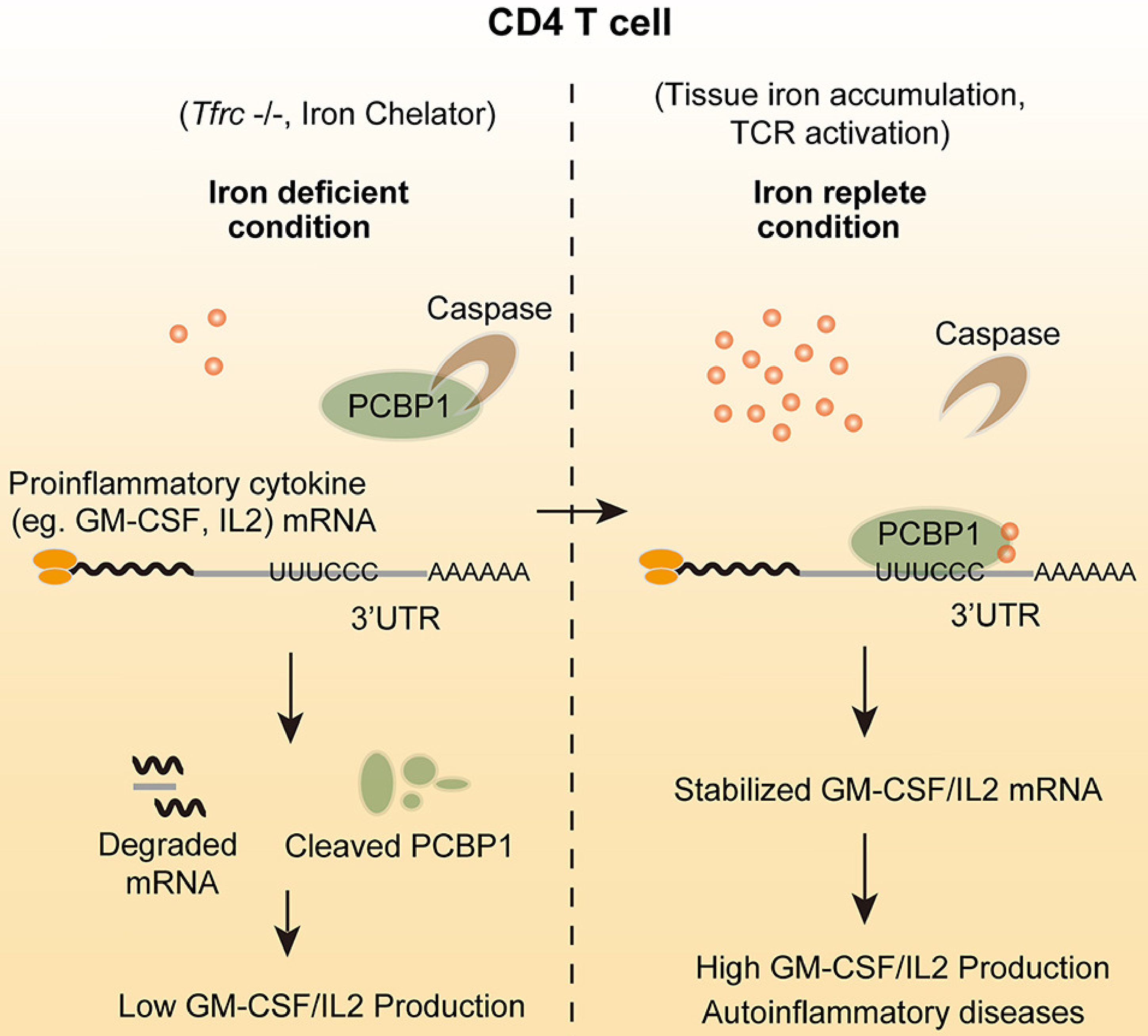 在辅助性T细胞中,胞内铁离子充足时,PCBP1蛋白稳定表达,GM-CSF等促炎性细胞因子mRNA半衰期延长,从而大量产生细胞因子;胞内铁离子匮乏时,PCBP1被Caspase剪切降解,GM-CSF等促炎性细胞因子mRNA半衰期缩短,快速降解,从而使细胞因子产生受损。