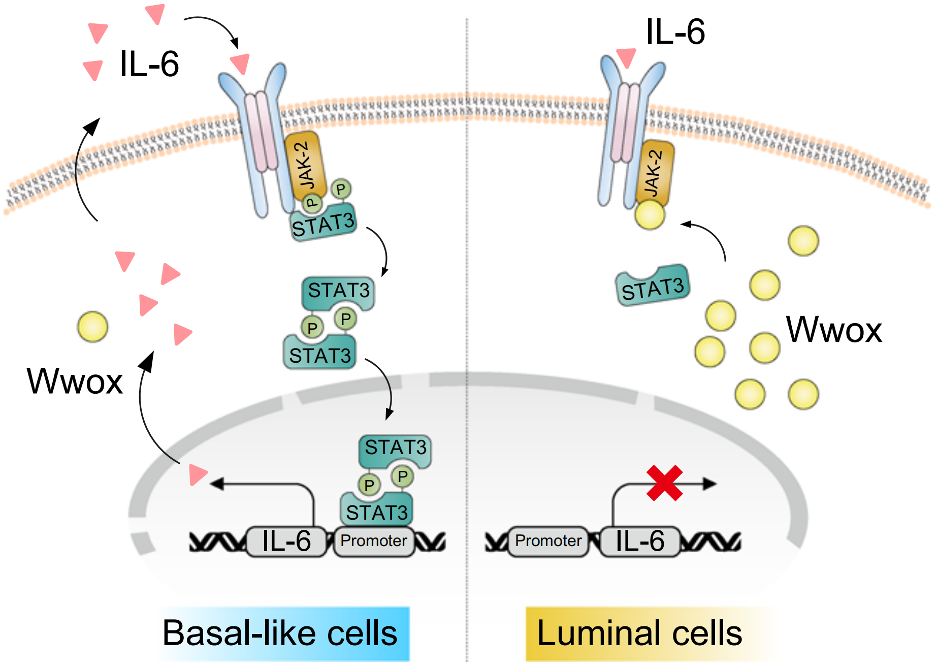 脆性位点基因Wwox作为抑制子在三阴性乳腺癌中与IL6/JAK2/STAT3通路持续活化呈负相关及其作用模式图