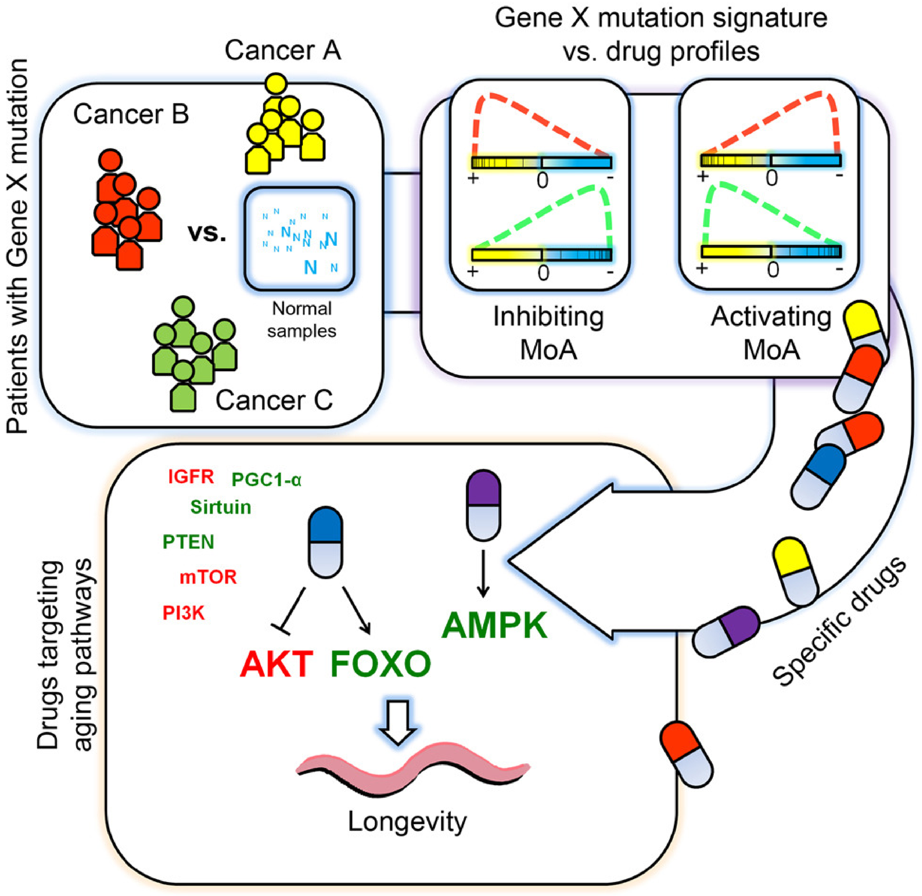 针对药物重定位的大规模实验筛选常常被局限在基于体外细胞或非人模式动物的环境下进行,缺少对真实人体情况的反映。基于细胞实验的筛选结果通常带有细胞系特异性,而且所能研究的靶点数目有限。在该研究中,研究人员构建了基于人体内环境的无细胞或组织特异性偏好的高通量药物靶基因的计算筛选方法,从TCGA癌症数据库中提取了8476个人类编码基因的单基因突变的、非组织特异性的“转录组核心标签”并将癌症背景予以去除,从而构建了全基因组水平的单基因靶点的筛选体系;并开发了“核心标签-药物-基因相互作用”(core-signature Drug-to-Gene, csD2G)算法,用这8476个转录组核心标签分别扫描3546个药物处理转录组标签来预测药物重定位新靶点,并且构建药物-靶点特异性评估体系,为1938个药物和3758个基因筛选出179004个高特异性的药物-基因靶向关系。在靶点预测的覆盖率和特异性上,csD2G优于体外细胞实验基因干扰标签、L1000实验标签的药物-靶点预测、以及现存的药物重定位算法。研究人员随后将该方法扩展到三方面研究予以应用:1)重定位一类抗精神病药物(吩噻嗪)去抑制TGF-β信号通路;2)重定位一类降血压药(钙离子通道拮抗剂)去激活AMPK、抑制AKT信号通路,并用临床电子病历验证;3)重定位并功能验证7个药物去特异选择性地靶向AKT-FOXO及AMPK通路,并延长线虫寿命。