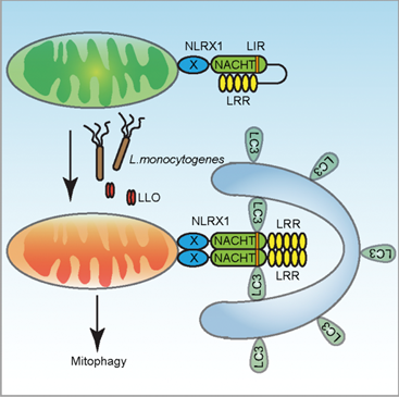 图注:李斯特菌通过其分泌的毒素蛋白LLO诱导线粒体损伤,促进NLRX1发生多聚化并与自噬蛋白LC3结合进而促进线粒体自噬通路的激活。
