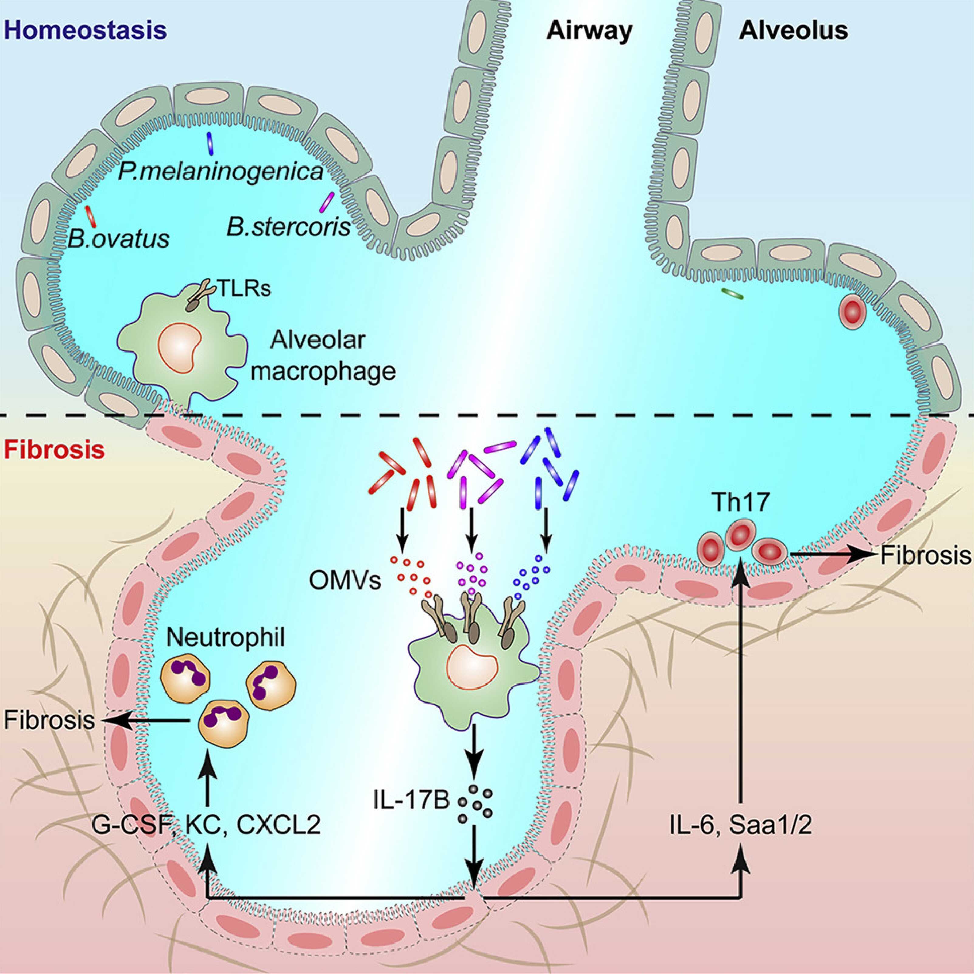 图注:肺组织中异常升高的微生物菌群通过分泌OMVs调控巨噬细胞IL-17B的产生从而促进肺纤维化病理发生。