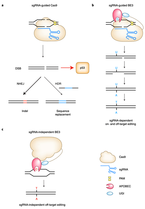 a, Cas9介导的基因编辑与其激活的DNA损伤响应。b, BE3在sgRNA依赖性的靶向位点和脱靶位点介导碱基编辑。c, BE3在sgRNA非依赖性的脱靶位点介导碱基编辑。