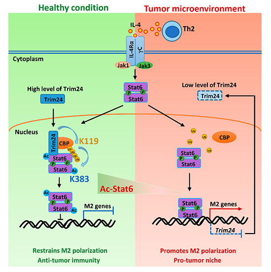 进一步的体内研究表明,Trim24基因在巨噬细胞中缺失后抑制了肿瘤微环境TAMs中Stat6蛋白K383位点的乙酰化修饰,进而促进了TAMs向M2方向的极化,由此促进了肿瘤的生长。研究人员还发现,乳腺癌病人肿瘤组织中TAMs相较癌旁正常组织中巨噬细胞表达更低水平TRIM24与更高水平的M2基因,且肿瘤细胞条件性培养基能明显抑制人单核或巨噬细胞中TRIM24表达。这些结果提示肿瘤微环境可能通过抑制TAMs中Trim24的表达进而抑制Stat6的乙酰化,从而进一步促进了TAMs向M2方向极化,并维持了肿瘤中免疫抑制性的微环境状态。因此,靶向Stat6乙酰化修饰或者Trim24活性可以作为肿瘤免疫干预的潜在分子靶标。