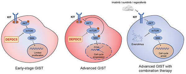 (左):早期间质瘤中DEPDC5抑癌基因功能正常,肿瘤细胞的增殖能力有限;(中):晚期间质瘤中DEPDC5基因突变,抑癌功能丧失,肿瘤细胞的增殖能力显著增强;(右):联合应用mTOR抑制剂和KIT激酶抑制剂(如格列卫等)显著抑制DEPDC5失活间质瘤的生长