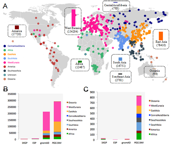 图:PGG.SNV基因组数据的人群和地理分布概览。