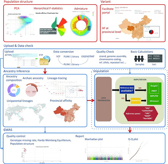 经过多年的努力和积累,徐书华研究组联合多家研究单位,促成10万人汉族基因组计划(The Han100K Initiative)的启动和实施。Han100K计划的成员单位和合作者可以通过链接(https://www.hanchinesegenomes.org/HCGD/about)查询,并且处于持续更新中。作为该计划一期成果,汉族基因组数据库及在线分析平台(PGG.Han)肩负着重要使命。PGG.Han是目前唯一针对汉族人群的、也是最大规模的、集数据存储、发布与在线分析为一体的参考基因组数据平台。当前上线的PGG.Han版本主要基于对早前基因组数据的收集和分析整理,更专注于提供平台和构架,为后期持续纳入的高质量深度测序数据奠定基础。目前PGG.Han的汉族样本在地理分布上共覆盖了33个省级行政地区及部分海外汉族群体。PGG.Han不仅提供了汉族人群的精细人群遗传结构图谱可视化等位基因频率地图,更重要的是还整合了三个实用性强的在线分析工具;包括祖源推断(AncestryInference),基因型填补(Genotype Imputation)和全基因组关联分析(GWAS)。这些分析流程由徐书华研究组设计与开发,由生物医学大数据中心进行软件封装,并首次提供免费公开访问和使用。用户可以上传自己的样本数据,充分利用数据库中存储的汉族自然人群参考数据集进行在线分析,最终得到可供下载的分析报告。所有上传数据均受到严格的保护,同时考虑了非计算生物学背景人员的可操作性,并在持续改善用户体验。目前正力图通过广泛合作持续纳入更多高质量深度测序数据,以及提升该数据库所依赖的高性能计算分析能力。