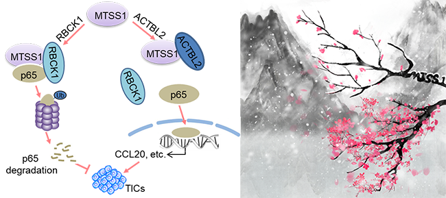 此项研究发现,在管腔型和基底型乳腺癌小鼠肿瘤模型中,敲除Mtss1增强了正常乳腺上皮细胞向肿瘤起始细胞的转化,并提高其致瘤性和转移性。在乳腺癌病人来源的异体移植物和类器官中同样证实了MTSS1抑制肿瘤起始的功能以及乳腺癌细胞的迁移与侵袭,表明MTSS1是乳腺癌发生发展的负调控因子。机制研究表明, MTSS1与E3泛素连接酶RBCK1相互作用,促进RBCK1介导的p65蛋白的泛素化及降解,从而抑制NF-κB信号通路和肿瘤形成。同时,在癌细胞内存在另一蛋白ACTBL2,能通过与RBCK1竞争性地结合MTSS1,进而稳定p65,激活NF-κB下游靶基因的转录,促进肿瘤发生。