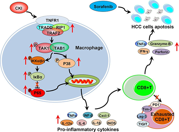 复方苦参注射液在临床上被批准用于治疗癌症引起的疼痛。前期研究表明复方苦参注射液能提高肝动脉插管化疗栓塞的治疗效果,但复方苦参注射液在调节肝癌免疫微环境以及肝癌治疗方面仍不清楚。在本研究中,博士研究生杨阳等在王慧研究员、巴乾副研究员和杨成华研究员的指导下,通过体内和体外实验发现复方苦参注射液通过抑制促肿瘤M2-TAMs的浸润及分化,提高抗肿瘤M1-TAMs的浸润及分化,从而增加肿瘤微环境中的CD8+T细胞数量并增强CD8+T细胞的肿瘤杀伤能力,同时降低CD8+T细胞的功能耗竭来维持持续的免疫杀伤活性。作为免疫调节剂,复方苦参注射液增敏低剂量索拉菲尼的肝癌治疗效果,抑制肝癌复发,并降低索拉菲尼的肝脏毒性。机制研究揭示复方苦参注射液靶向TAMs表面TNFR1及其介导的NF-κB/P65、P38/MAPK信号转导促进抗肿瘤M1-TAMs的分化,进而激活CD8+T细胞的抗肿瘤活性。综上,该研究揭示了复方苦参注射液抗肝癌的作用机制,表明传统中药复方作为免疫调节剂与化疗药物联合使用可能是肝癌治疗的一种新策略。