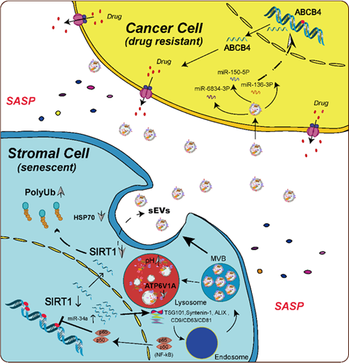 研究人员发现,同机体正常细胞相比,衰老基质细胞释放的小胞外囊泡数量、粒径和分布范围均发生深刻改变。衰老细胞中被动激活的转录机器NF-κB在驱动大量SASP因子产生的同时,也下调了NAD+-依赖性去乙酰化酶SIRT1这一抗衰老蛋白的表达。伴随SIRT1渐进性衰退的,则是全蛋白组泛素化水平的明显上升。与此同时,多亚基液泡H+-ATPase(V-ATPase)的催化亚基A(ATP6V1A)表达降低,造成衰老细胞溶酶体酸性化(acidification)功能失衡,最终导致小胞外囊泡的胞内合成与胞外释放大幅增加。在SIRT1激活剂SRT2104(或SRT1720)的作用下,衰老基质细胞合成胞外囊泡的能力被显著控制。在肿瘤微环境中,衰老细胞的胞外囊泡能够改变癌细胞的表达谱,包括以磷脂酰胆碱为底物的p-糖蛋白转运家族成员ABCB4表达上调,而其所涉及的药物外排泵活性随之上升。癌细胞的这一变化促成了其自身对化疗药物的显著抵抗,而敲除ABCB4或使用SRT2104则能有效降低衰老基质细胞小胞外囊泡赋予微环境中癌细胞的这种获得性耐药的潜力。