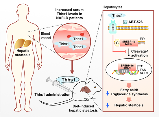 李于研究组与复旦大学附属中山医院高鑫研究组联合培养的研究生白金运等发现在肝活检明确诊断的脂肪肝患者中,血清Thbs1水平明显升高,而在接受降肝脂治疗后,患者血清Thbs1水平明显降低。外源性重组Thbs1蛋白可以抑制高脂饮食诱导的小鼠肝脏脂质合成从而改善脂肪肝。进一步研究发现,Thbs1对上述脂质合成途径的抑制作用在CD36受体基因敲除的小鼠肝原代细胞中消失,表明Thbs1可能通过作用于CD36受体发挥抑制脂质过度合成的作用。本研究发现,Thbs1的多肽类似物ABT-526同样具有抑制肝细胞脂质沉积的作用。这些研究结果发现了非酒精性脂肪肝的新型生物标志物与潜在治疗靶点,具有临床转化潜质。
