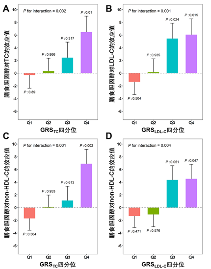 A. 随着GRSTC的升高,膳食胆固醇对血液TC升高的作用增强;B. 随着GRSLDL-C的升高,膳食胆固醇对血液LDL-C升高的作用增强;C. 随着GRSTC的升高,膳食胆固醇对血液non-HDL-C升高的作用增强;D. 随着GRSLDL-C的升高,膳食胆固醇对血液non-HDL-C升高的作用增强。