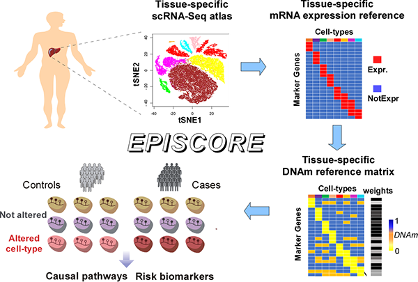 近期,中国科学院上海营养与健康研究所Andrew Teschendorff研究员指导的研究团队开发了一种名为“EPISCORE”的新型算法,用以从单细胞RNA-Seq中分析获得给定组织类型中的各种细胞类型,并从中发现蕴含与疾病发生相关DNA甲基化变化的特定细胞类型。EPISCORE算法利用了组织特异性单细胞RNA-Seq图谱数据(比如Human Cell Atlas Consortium)的强大功能和高分辨率特性,基于细胞类型特异性标记物的DNA甲基化差异特性,有效地将组织特异性mRNA表达图谱转化为单细胞分辨率的组织特异性DNA甲基化图谱。利用EPISCORE算法对肺癌数据开展研究,成功揭示了肺癌内皮细胞中的DNA甲基化表观遗传改变,提示表皮细胞向间充质细胞的转化过程是癌细胞入侵和转移的基础。