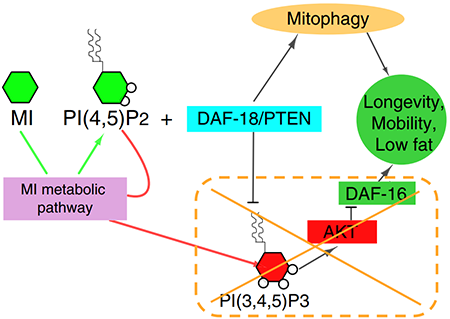 该研究进一步发现,myo-inositol延缓衰老依赖于其代谢通路中的另一个酶,daf-18(Pten),该基因有多种功能,研究最多的是其作为抑癌基因的功能。但研究者发现myo-inositol主要通过daf-18(Pten)提高线粒体自噬的功能实现延缓衰老的效应。