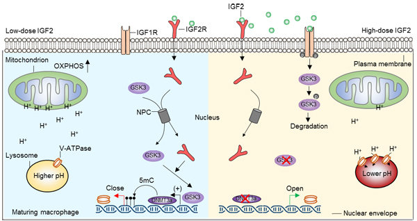 该研究组于2019年在Cell Metabolism上报道了他们干细胞研究的新发现。低氧处理的间充质干细胞借以IGF2,预编程巨噬细胞的氧化磷酸化代谢倾向性并决定其抗炎特性,有效地抑制自身免疫性疾病。在此基础上,王雪枫博士等发现IGF2对于自身免疫性疾病的治疗作用和对巨噬细胞的调控与剂量密切相关——低剂量IGF2促进抗炎巨噬细胞的形成从而缓解疾病,然而高剂量IGF2有利于促炎巨噬细胞的形成而加重疾病。鉴于IGF2与IGF2R的亲和力高于其与IGF1R的亲和力,IGF2双向调节自身免疫性疾病的特性可能与其差异性激活IGF1R和IGF2R有关,为此,研究构建了髓系细胞条件性敲除IGF1R或IGF2R的小鼠,并证明IGF2对于抗炎巨噬细胞的调控依赖于IGF2R,而其对促炎巨噬细胞的调节则主要依赖于IGF1R。通过一系列机制研究,证明低剂量IGF2优先结合IGF2R,诱导IGF2R向细胞核内化,核内IGF2R促进GSK3α/β与染色质结合来激活Dnmt3a表达,维持V型ATP酶相关基因的高甲基化状态,从而抑制V型ATP酶表达,导致溶酶体酸化受限,积累在细胞质中的H+以顺化学梯度方式进入线粒体膜间隙,推动氧化磷酸化,赋予巨噬细胞抗炎记忆。研究人员将这个H+向溶酶体内化受限,转而进入线粒体膜间隙的过程命名为质子改道(proton rechanneling)。此外,研究证明,高剂量IGF2不但结合IGF2R,还可以快速激活IGF1R-AKT信号通路,通过磷酸化GSK3α/β并抑制其功能,阻断质子改道,促进有氧糖酵解,使得巨噬细胞具有促炎功能。此外,研究发现靶向性激活IGF2R,赋予巨噬细胞抗炎记忆,显著抑制腹膜炎和炎症性肠病。研究表明天然免疫具有强大的免疫调控能力,维持正常机体的免疫稳态,在代谢性疾病、癌症、感染等发挥重要作用。天然免疫调控的持续性以及是否有适应性免疫的相似的记忆,一直是科学家关注的热点。本项研究发现IGF2R靶向活化引起质子在溶酶体和线粒体中的重分布机制及其在决定巨噬细胞抗炎特性中的关键作用,为理解天然免疫和自身免疫性疾病和炎症性疾病治疗调控了新的靶标和治疗策略。