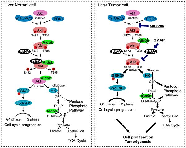 图一. 醛缩酶B调控肝癌Akt信号通路新机制。在正常肝细胞中, Aldob除了发挥代谢酶功能外还与Akt结合, 招募蛋白磷酸酶PP2A去磷酸化p-Akt, 防止其过度激活。在肝癌肿瘤细胞中,Aldob的丢失造成Akt的激活,促进肿瘤细胞增殖与葡萄糖代谢。利用Akt的别构抑制剂MK2206抑制Akt的酶活,或者PP2A的激活剂SMAP激活的PP2A活性均可以抑制由于Aldob丢失引起的肝癌。