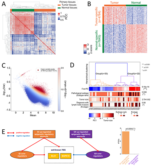 图:(A)肺腺癌病人肿瘤组织表现出更高的表观异质性。(B)MAnorm2鉴定的肿瘤和瘤旁正常组织之间差异H3K27ac修饰位点。(C)鉴定病人肿瘤组织间显著高差异的H3K27ac位点。(D)基于病人肿瘤表观异质性将42例肺腺癌病人分为病理显著不同的两个亚组。(E)两个亚组各自特异的核心调控因子和表观调控元件对抑癌基因的差异调控作用。