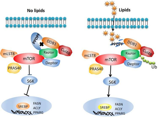 研究人员发现肝脏特异性敲除PPDPF的小鼠正常饲养32周后自发形成脂肪肝,而高脂饮食(HFD)可以加速脂肪肝的发生和发展。机制研究表明,PPDPF通过干扰Raptor和CUL4B-DDB1之间的相互作用,阻止Raptor的泛素化和活化,进而负调控mTORC1-S6K-SREBP1信号,减少脂质合成,抑制脂肪肝发生发展。在野生型小鼠的肝脏中特异性过表达PPDPF有效抑制了mTORC1信号通路的激活和肝脏的脂肪变性。这些结果表明,PPDPF是mTORC1在脂代谢中的新型调节因子,并为非酒精性脂肪肝病提供了治疗候选靶点。